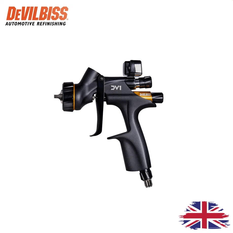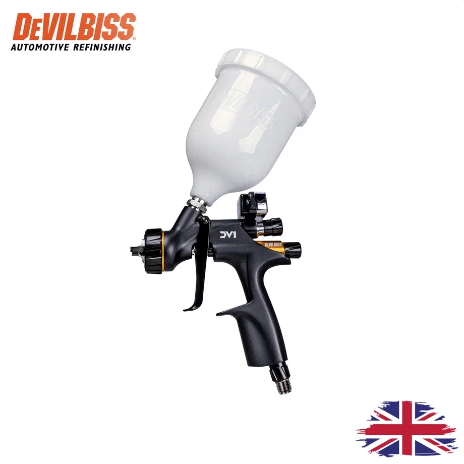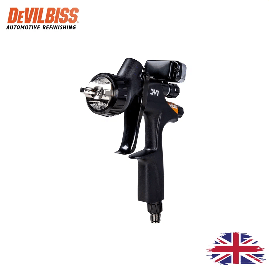 DeVILBISS DV1-C1+ (Clearcoat): Оснащен воздушной головой с технологией HVLP. Обеспечивает максимальный коэффициент переноса и мягкое нанесение. Идеален для стандартных лаков и условий, где важна экономия материала.