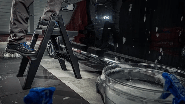 В студиях детейлинга, моечных станциях, автомастерских лестница незаменима для работы с такими труднодоступными местами, как крыши высоких автомобилей (внедорожники, грузовики, автобусы). Также при необходимости её можно использовать в качестве подставки для вёдер с водой, автохимией, инструментов и прочих аксессуаров. По завершению работы она компактно складывается для хранения, не занимая много места. Ручка в виде прорези в площадке упрощает транспортировку.