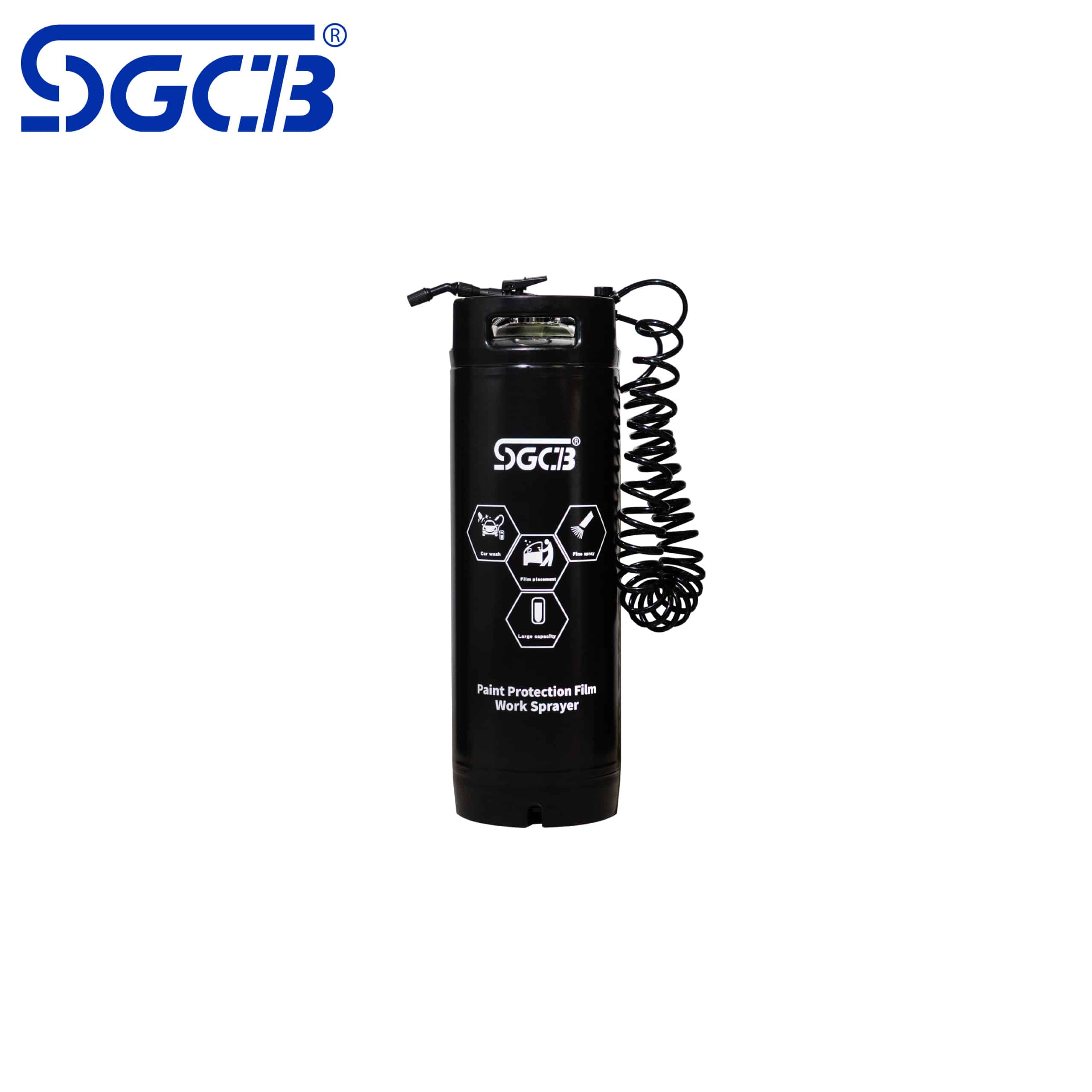 SGCB PPF Pressure Sprayer – пневматический распылитель, предназначенный для нанесения мыльного раствора при оклейке автомобилей полиуретановой пленкой (PPF) и тонировании стёкол. Оснащен баком объёмом 19 литров, что обеспечивает длительную работу без необходимости частой дозаправки, а также двумя шлангами, что позволяет работать одновременно двум операторам.